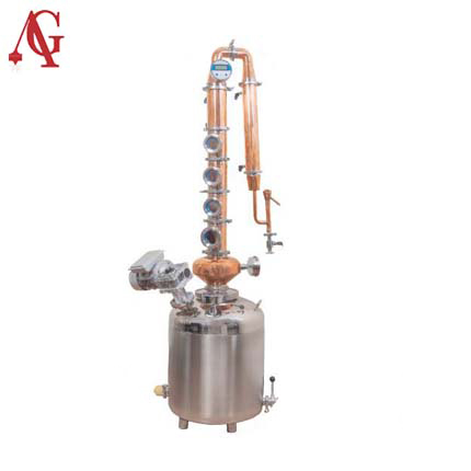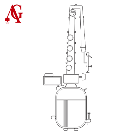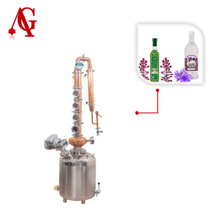 این دستگاه تقطیر از بخشهای مخزن یا دیگ، برج و کلاهک تقطیر تشکیل شده است که مخزن از استیل و برج و کلاهک از مس تهیه شدهاند. این دستگاه تقطیر برقی ۱۰۰ لیتر ظرفیت دارد و مجهز به سه عدد ترمومتر جهت اندازه گیری دقیق دما میباشد.